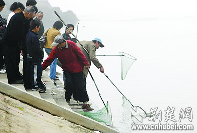 荊楚網(wǎng)(楚天都市報)記者陳曙光 葉茂林 實習生 楊子鈺 王高偉:昨日上午,一群市民來到長江一橋下武昌江灘,將一批小魚放生,很快便有人在放生處捕撈。