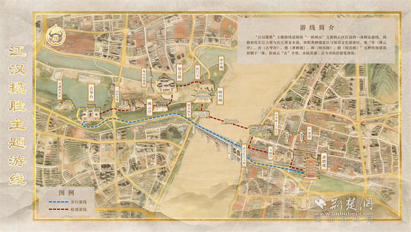 “江漢攬勝”主題游線以百年輪渡為紐帶,串聯(lián)起5A級(jí)黃鶴樓景區(qū)與4A級(jí)知音文化旅游區(qū),集亭、臺(tái)、樓、閣、殿五種傳統(tǒng)建筑形制于一體,生動(dòng)展現(xiàn)武漢“半城山水半城詩(shī)”的城市意象。游線自黃鶴樓啟程,途經(jīng)斗級(jí)營(yíng)、戶部巷,乘輪渡橫渡長(zhǎng)江,觀賞晴川燈會(huì),最終探訪知音殿、游覽古琴臺(tái),集萃武漢長(zhǎng)江兩岸自然風(fēng)光、文化地標(biāo)與城市煙火氣,是自然與人文、傳統(tǒng)與現(xiàn)代交融的精品線路。