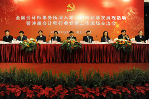 11月26日,財政部會計師事務所深入學習實踐科學發(fā)展觀活動指導小組、中國注冊會計師行業(yè)黨委在湖北省武漢市召開全國會計師事務所深入學習實踐科學發(fā)展觀活動暨注冊會計師行業(yè)黨建工作現(xiàn)場交流會,深入學習貫徹黨的十七屆四中全會精神,總結各省市區(qū)會計師事務所學習實踐活動和行業(yè)黨建工作做法,交流經(jīng)驗,探討方法,凝聚共識,更加扎實有效地推進會計師事務所學習實踐活動和行業(yè)黨建工作。財政部黨組成員、副部長、財政部會計師事務所深入學習實踐科學發(fā)展觀活動指導小組副組長、中國注冊會計師行業(yè)黨委書記王軍,湖北省委常委、常務副省長李憲生出席會議并講話。